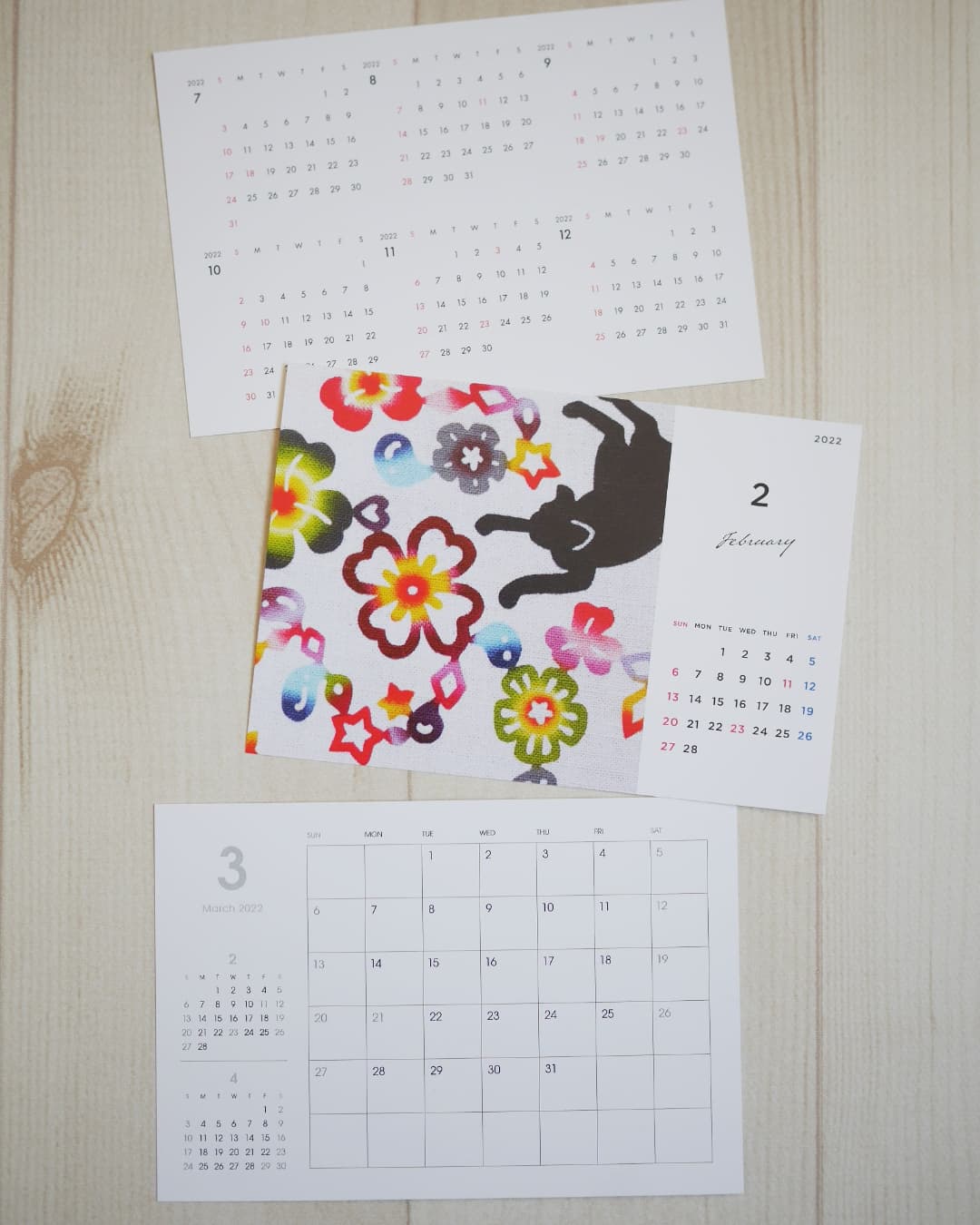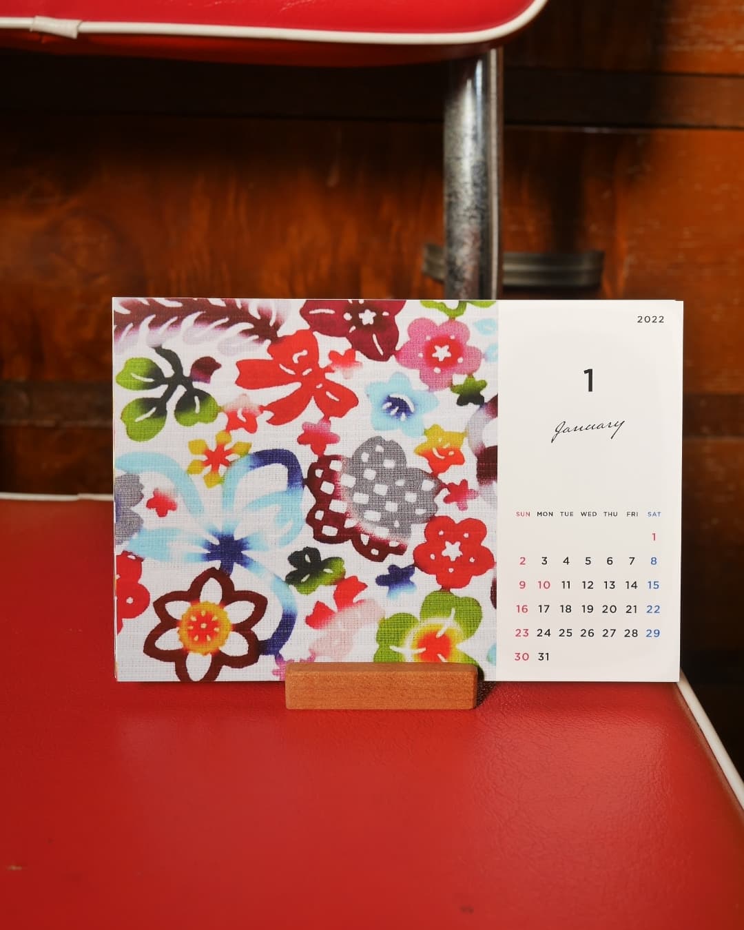 2022年1月スタートの卓上カレンダー、ポストカードサイズで木製のスタンド付です。